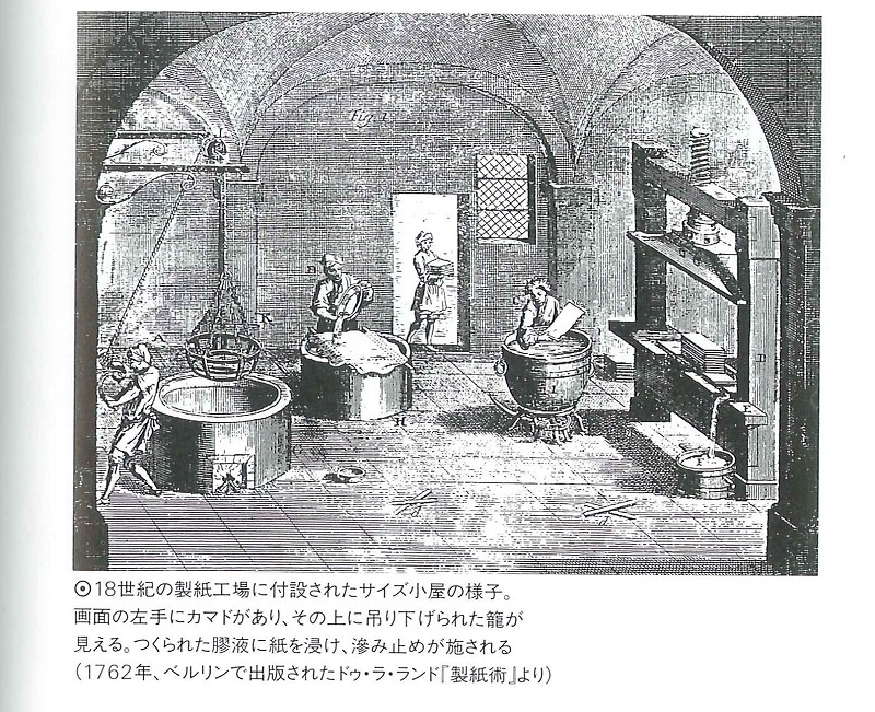 | 西洋の紙すきの様子。西洋の筆記具は細く固いペン先で表面を引っかく書法のため、 紙は固い表面に仕上げなければならず、またにじみ止めが必須だった。 |