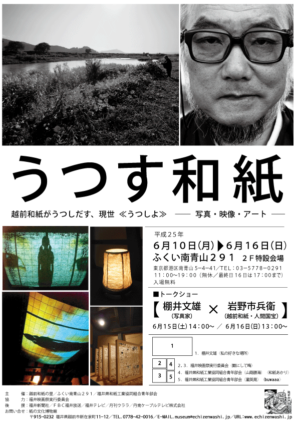 棚井文雄氏による、和紙の里のシーンを白黒プリントで越前和紙にプリントして展示します。 1900年のパリ万博で金賞を受賞した、三椏(みつまた)局紙もついにお披露目 |